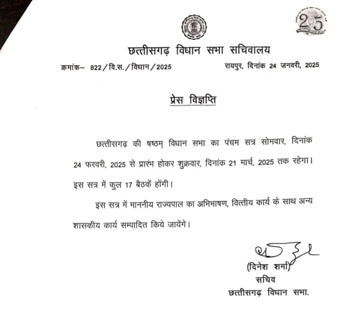 रायपुर . छत्तीसगढ़ विधानसभा के बजट सत्र की अधिसूचना जारी कर दी गई है। सत्र की बैठक 24 फरवरी से शुरू होगी और 21 मार्च तक चलेगी। इस दौरान सदन की 17 बैठक होगी।