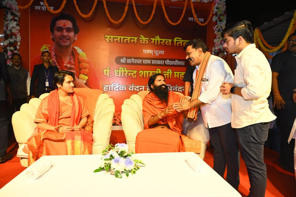 रायपुर . बाबा रामदेव ने गृहमंत्री विजय शर्मा के निवास में आशीर्वचन दिया। जानकारी साझा करते गृहमंत्री विजय शर्मा ने बताया, कल देर रात्रि हमारे निवास में योगगुरु पूज्य बाबा रामदेव जी एवं बागेश्वर धाम के पीठाधीश्वर पूज्य पंडित धीरेंद्र कृष्ण शास्त्री जी का शुभ आगमन हुआ। पूज्य बाबा रामदेव जी ने हम सभी को आशीर्वचन दिया।