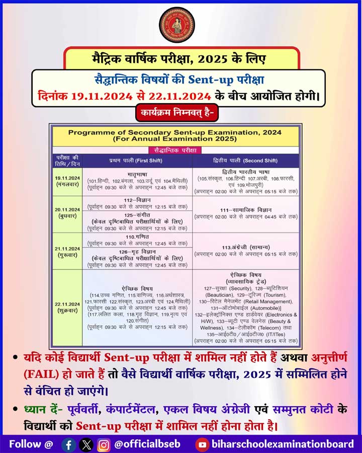 बिहार बोर्ड मैट्रिक सेंटअप परीक्षा की डेटशीट ( BSEB Bihar Board Matric Sent-UP Time Table 2024-2025)