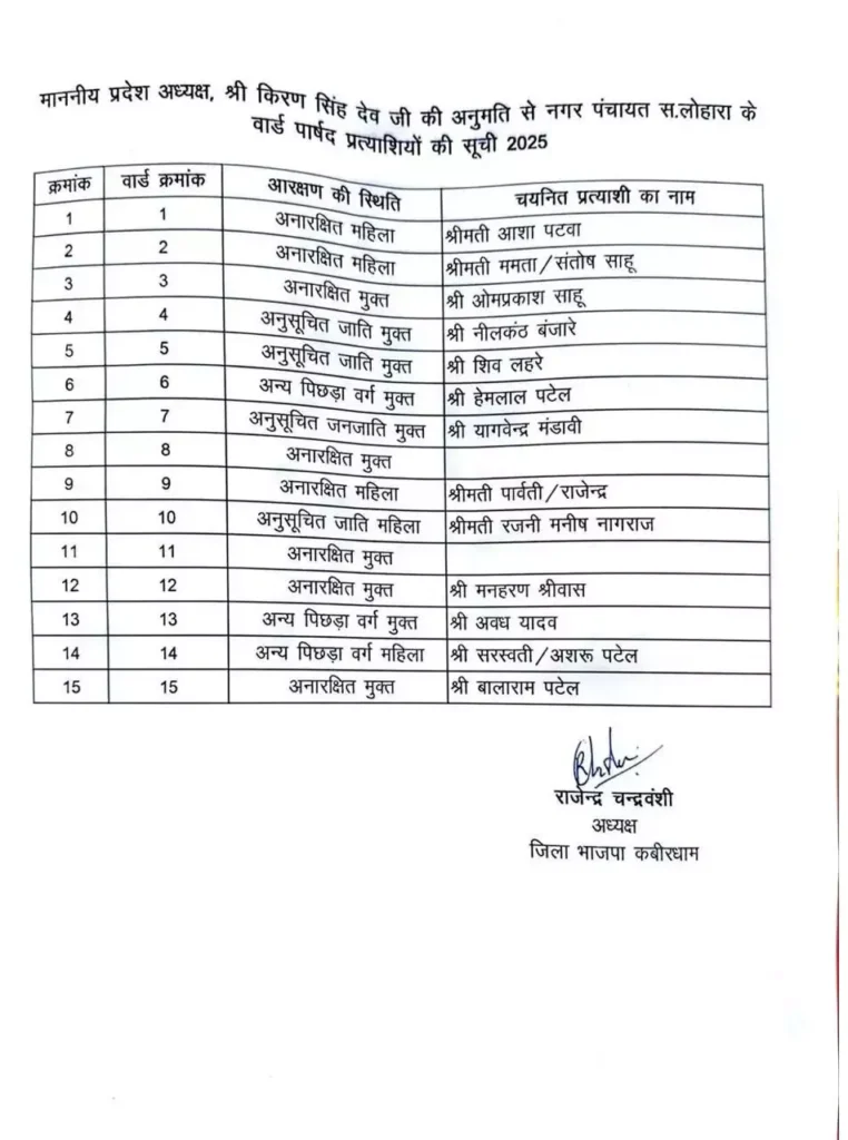 भाजपा ने जांजगीर-चांपा, कवर्धा और रायगढ़ नगर पंचायत के लिए प्रत्याशियों की लिस्ट जारी कर दी है।