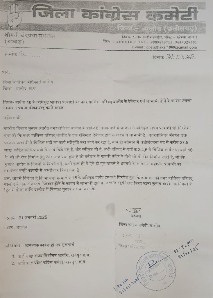 कांग्रेस ने इस संबंध में जिला निर्वाचन अधिकारी को एक आवेदन सौंपते हुए कहा कि गुप्ता बालोद नगर पालिका के रजिस्टर्ड ठेकेदार हैं और ठेकेदार होने के कारण उनका नामांकन नियमों का उल्लंघन करता है. कांग्रेस की ओर से शिकायत के बाद भाजपा के प्रत्याशी गिरजेश गुप्ता की मुश्किलें बढ़ गई है.