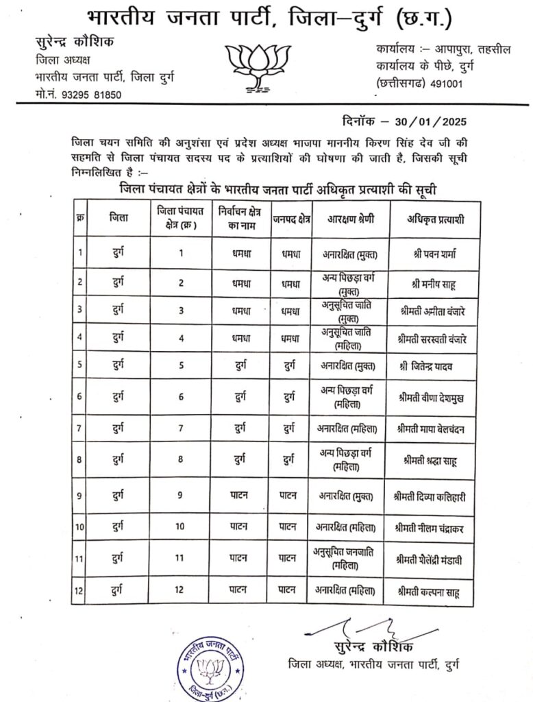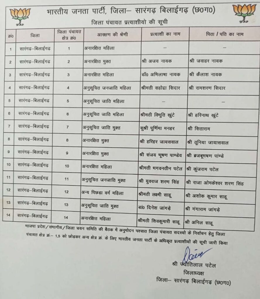 रायपुर . भाजपा ने सारंगढ़-बिलाईगढ़ और दुर्ग जिला पंचायत के लिए प्रत्याशियों की सूची जारी कर दी है। यह सूची भाजपा जिलाध्यक्ष ज्योति पटेल ने अधिकृत प्रत्याशियों सूची जारी की है। जिला पंचायत क्षेत्र क्रमांक 1 और क्षेत्र क्रमांक 5 में प्रत्याशियों का नाम नहीं हुआ जारी है। भाजपा ने 12 जिला पंचायत क्षेत्र के लिए प्रत्याशी तय किए हैं।