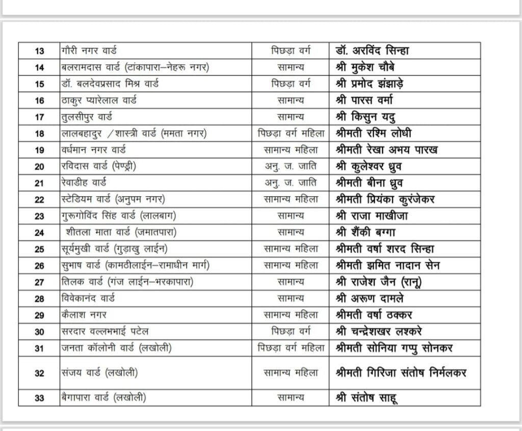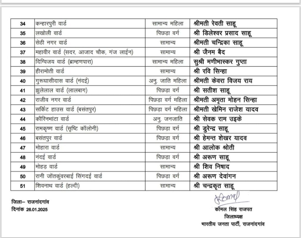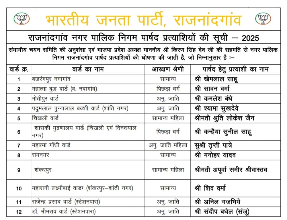 रायपुर . भाजपा ने राजनांदगांव नगर पालिक निगम पार्षद पद के लिए प्रत्याशियों की लिस्ट जारी कर दी है। इस लिस्ट के अलावा कवर्धा और भाटापारा नगर पालिका अध्यक्ष पद के लिए भी प्रत्याशियों की घोषणा कर दी है।