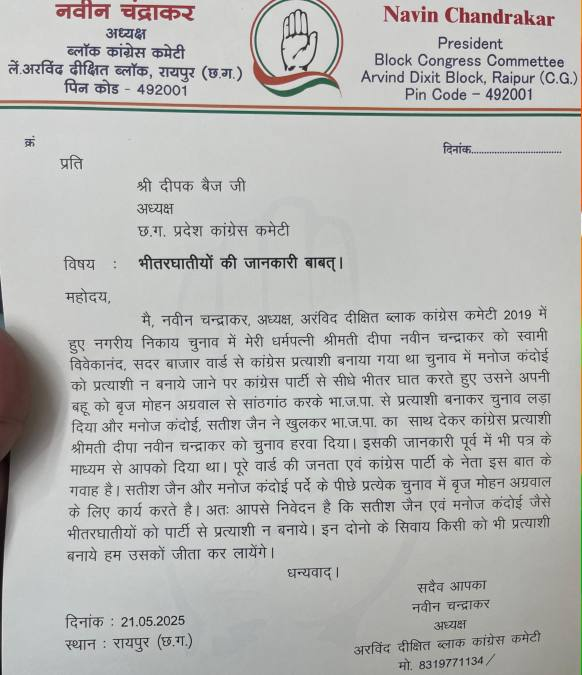 नवीन चंद्राकर ने अपने पत्र में आरोप लगाते हुए लिखा कि 2019 में सदर बाजार वार्ड से उनकी पत्नी दीपा चंद्राकर को प्रत्याशी बनाए जाने के बाद पूर्व पार्षद मनोज कंदोई ने भितरघात किया था. ब्लॉक कांग्रेस अध्यक्ष ने पीसीसी अध्यक्ष से साफ तौर पर कहा कि मनोज कंदोई और सतीश जैन को इस बार प्रत्याशी न बनाया जाए. साथ ही, उन्होंने यह भी स्पष्ट किया कि यदि इन दोनों के अलावा किसी और को प्रत्याशी बनाया गया, तो उसे जीत दिलाना उनकी जिम्मेदारी होगी.