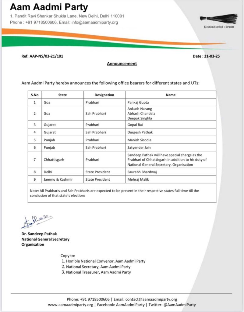 प्रदेश अध्यक्ष गोपाल साहू ने कहा कि हमारे छत्तीसगढ़ के बेटा आम आदमी पार्टी के चाणक्य के नाम से जाने जाने वाले डॉ.संदीप पाठक जी, राज्य सभा सांसद एवं राष्ट्रीय संगठन मंत्री जी को छत्तीसगढ़ का प्रभारी बनाया गया है, माननीय डॉ.पाठक जी के मार्गदर्शन में हम सबको काम करने का अवसर मिलना हम सब के लिए सौभाग्य की बात है। आने वाले समय में डॉक्टर संदीप पाठक जी के नेतृत्व में छत्तीसगढ़ प्रदेश में आम आदमी पार्टी जनता के सामने अपनी विचारधारा को रखेगी और प्रदेश में जनता से हो रहे अन्याय के खिलाफ मजबूती से अपना पक्ष रखेगी।