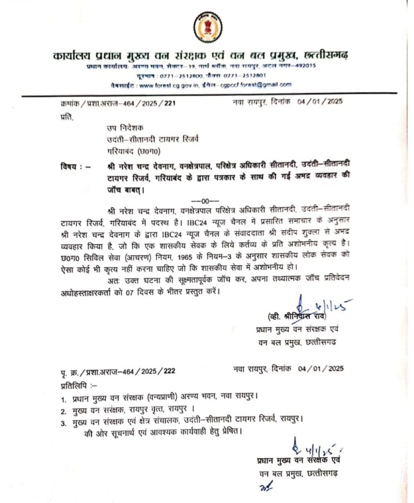 रायपुर. पत्रकार के साथ दुर्व्यवहार का एक मामला प्रकाश में आया है। उदंती-सीतानदी टायगर रिजर्व, गरियाबंद में पदस्थ वनक्षेत्रपाल परिक्षेत्र अधिकारी नरेश चन्द्र देवनाग पर इलेक्ट्रॉनिक मीडिया के एक संवाददाता के साथ अभद्र व्यवहार करने का आरोप लगा है। यह घटना शासकीय सेवक के आचरण के विरुद्ध मानी गई है, जो छत्तीसगढ़ सिविल सेवा (आचरण) नियम, 1965 के नियम-3 का उल्लंघन करती है।