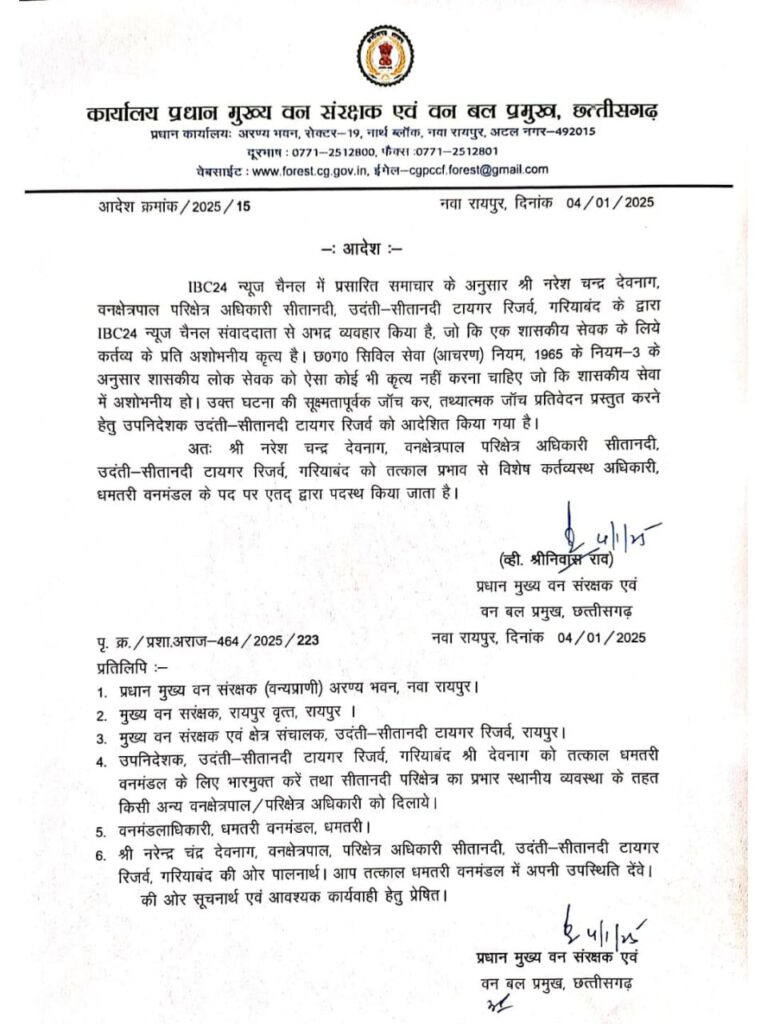दुर्व्यवहार के आरोपों के मद्देनजर, नरेश चन्द्र देवनाग को उनके वर्तमान पद से हटाकर विशेष कर्तव्यस्थ अधिकारी, धमतरी वनमंडल के पद पर पदस्थ कर दिया गया है।