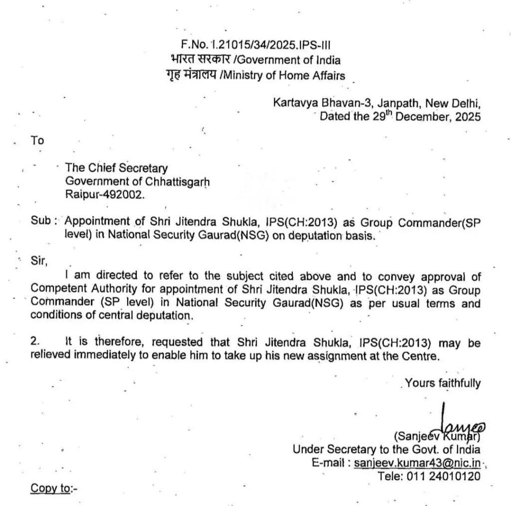 रायपुर । छत्तीसगढ़ कैडर के एक और आईपीएस अधिकारी केंद्र सरकार में प्रतिनियुक्ति पर सेवाएं देंगे। केंद्रीय गृह मंत्रालय ने आईपीएस जितेंद्र शुक्ला (CH:2013) को राष्ट्रीय सुरक्षा गार्ड (NSG) में ग्रुप कमांडर (SP स्तर) के पद पर नियुक्त किया है।