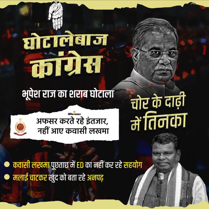 सोशल मीडिया पर भाजपा ने एक पोस्ट जारी किया है. इसमें शराब घोटाले में पूर्व आबकारी मंत्री कवासी लखमा नहीं पहुंचे पर कहा है कि भूपेश के कुशासन में हुए 2000 करोड़ रुपए के शराब घोटाले में ED के पूछताछ में बुलाए जाने पर पूर्व आबकारी मंत्री कवासी लखमा नहीं पहुंचे, उनका ED से बचना ये बताता है कि दाल में बहुत कुछ काला है. मामले में ईडी की पूछताछ में कवासी लखमा सहयोग नहीं कर रहे हैं और मलाई चाटकर खुद को अनपढ़ बता रहे हैं.
