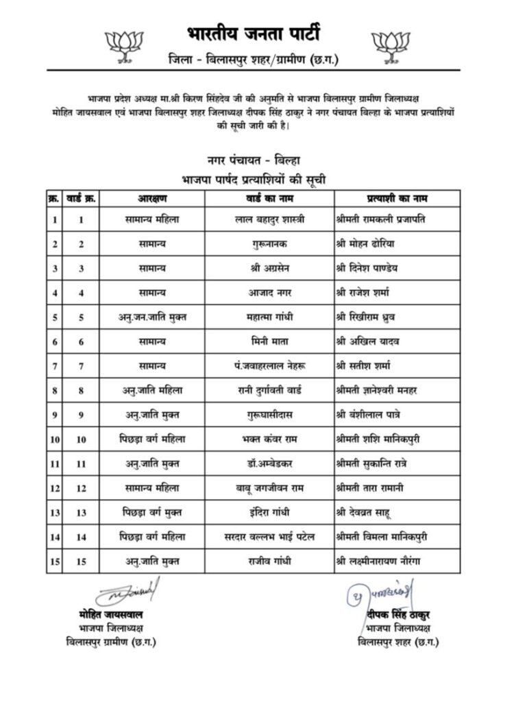 बिलासपुर . भाजपा ने बिलासपुर जिले की तीन नगर पंचायत बिल्हा, कोटा एवं मल्हार के पार्षद पद के उम्मीदवारों की सूची जारी कर दी है। इस सूची में 45 पार्षदों के नाम शामिल हैं।