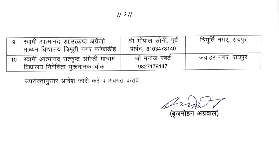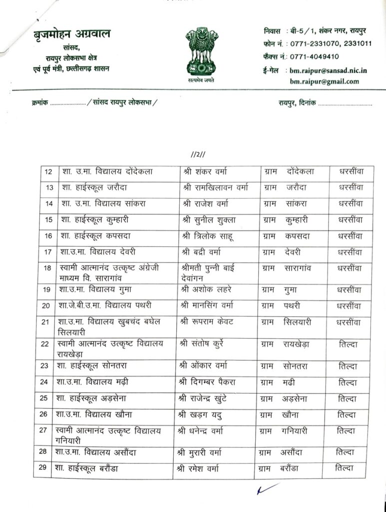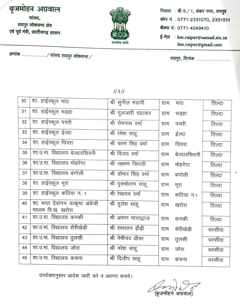 रायपुर। सांसद बृजमोहन अग्रवाल ने रायपुर लोकसभा क्षेत्र के अंतर्गत आने वाले रायपुर उत्तर, आरंग, अभनपुर, धरसीवां विधानसभा क्षेत्र के शासकीय हाई स्कूल और हायर सेकेण्डरी विद्यालयों में शाला विकास एवं प्रबंधन समिति (SMDC) के लिए सांसद प्रतिनिधियों की नियुक्ति की है।