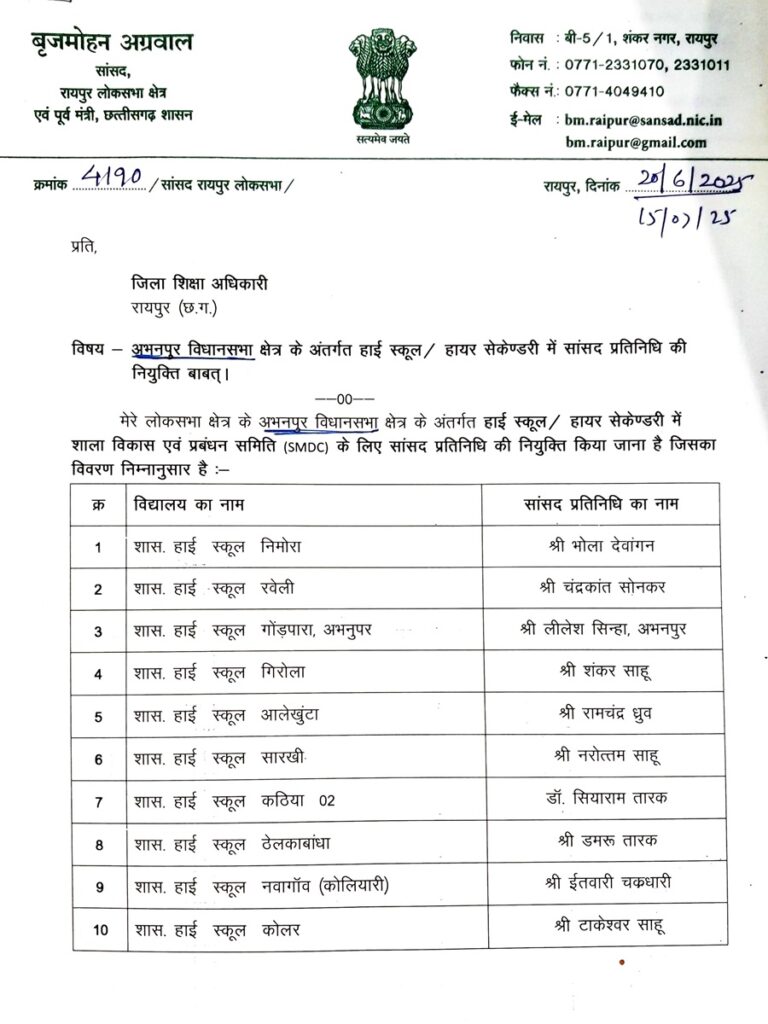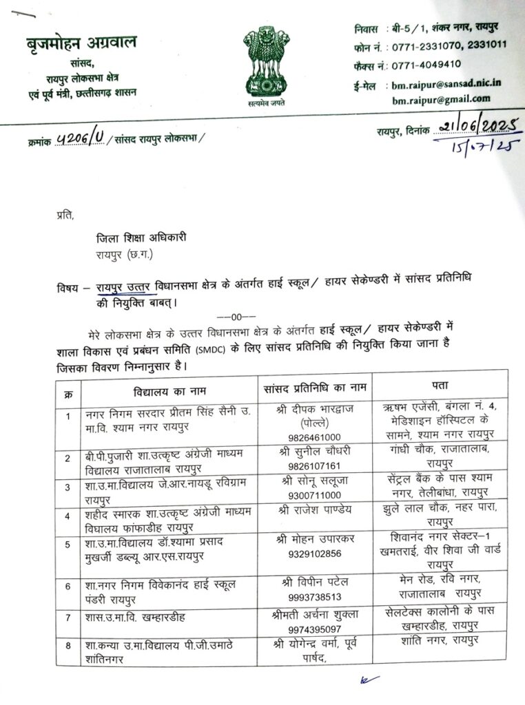 इस संबंध में उन्होंने जिला शिक्षा अधिकारी (DEO), रायपुर को पत्र लिखकर अधिकृत रूप से जानकारी दी है, ताकि समय रहते इन प्रतिनिधियों की नियुक्ति विद्यालयों की समितियों में की जा सके और वे स्कूलों के समग्र विकास में अपनी सक्रिय भूमिका निभा सकें।