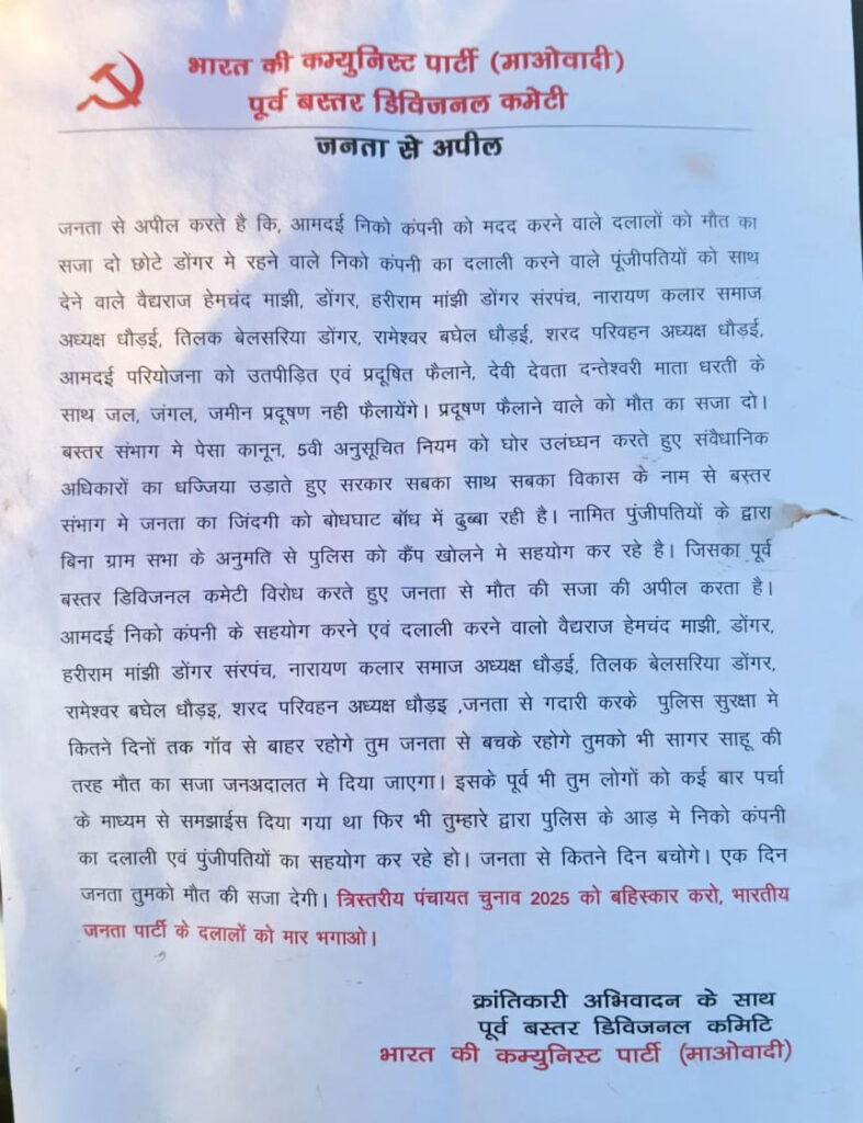 नक्सलियों ने पर्चा फेंक कर दूसरी बार दी धमकी