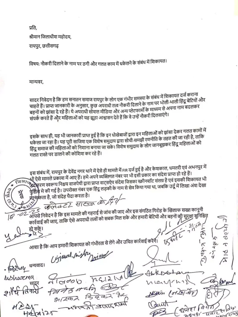 इस प्रकार की घटनाओं को ‘नौकरी जेहाद’ के रूप में देखा जा रहा है, जहां विशेष समुदाय के लोग जानबूझकर महिलाओं को गलत रास्ते पर डालने की कोशिश कर रहे हैं. निश्चय वाजपेयी ने व्यक्तिगत नंबर पर भी इसी प्रकार का संदेश प्राप्त किया है, जिसका स्क्रीनशॉट भी शिकायत के साथ संलग्न किया है. उन्होंने बताया कि उपरोक्त मैसेज एक हिंदू लड़की के नाम से भेजा गया था, जबकि उर्दू में लिखा अंश साफ देखा जा सकता है, जो संदेह पैदा करता है. बीतें दिनों तेलगाना से बीजेपी विधायक टी राजा ने इंदौर दौरे पर थे. इस दौरान एक कार्यक्रम में उन्होंने कहा था कि हमारी बहन-बेटियों को लव जिहाद के जरिए तो फंसाया ही जा रहा है, अब एक नया जिहाद रायपुर से सामने आया है. यह नौकरी जिहाद है. इसमें नौकरी देने के बहाने हमारी बहनों के साथ अन्याय किया जा रहा है.