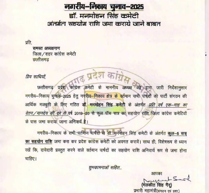 पीसीसी ने अपने पत्र में डॉ. मनमोहन सिंह कमेटी के निर्णय का हवाला देते हुए कहा है कि पार्टी संगठन को आर्थिक रूप से मजबूत करने के लिए प्रति वर्ष एक महीने की सैलरी, यानी कुल पांच साल के कार्यकाल के लिए पांच महीने की सैलरी पार्टी फंड में जमा करना अनिवार्य है। यह व्यवस्था वर्ष 2019-20 से लागू है।