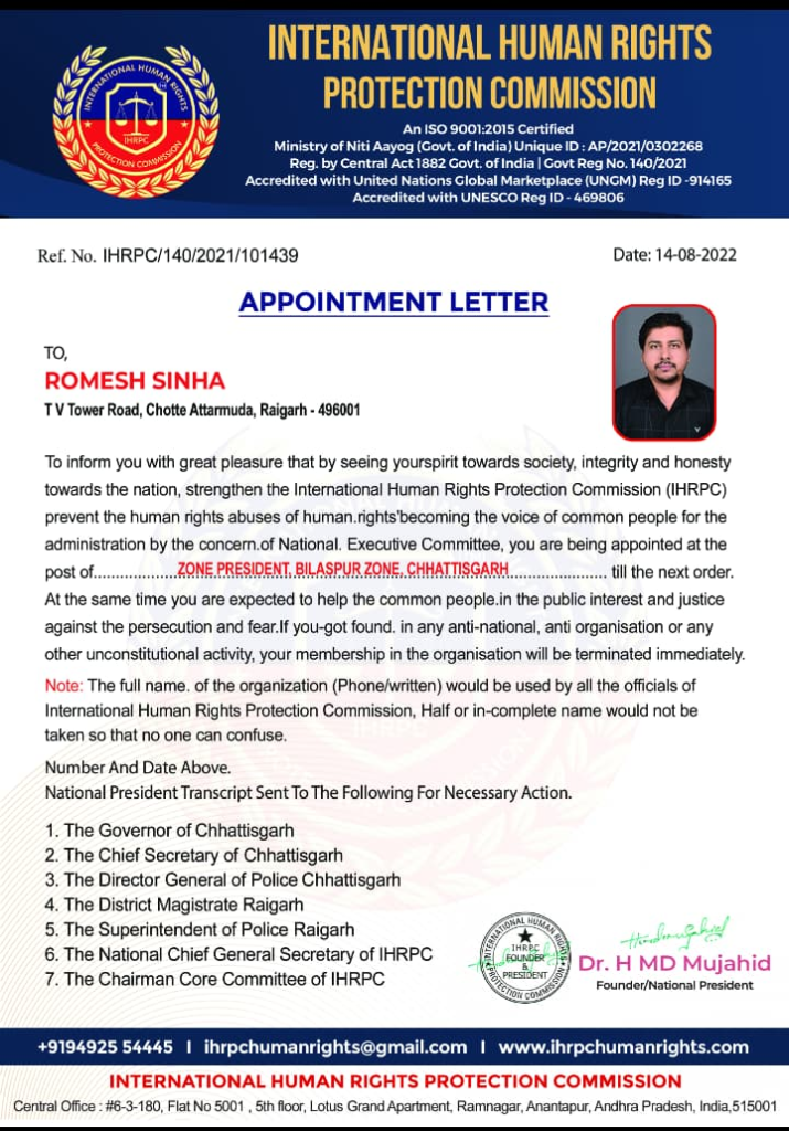 रायगढ़/बिलासपुर — अंतर्राष्ट्रीय मानव अधिकार संरक्षण आयोग के छत्तीसगढ़ प्रदेश अंतर्गत जिला रायगढ़ के जिला अध्यक्ष रोमेश सिन्हा को उनके उत्कृष्ट कार्य, संगठन के प्रति निष्ठा एवं मानव अधिकार संरक्षण के क्षेत्र में किए गए उल्लेखनीय योगदान को देखते हुए पदोन्नत किया गया है।