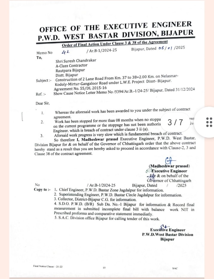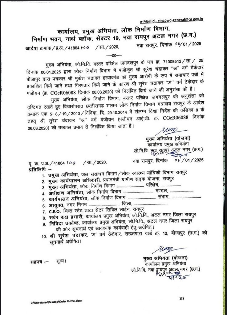 विभाग के एक अधिकारी ने बताया कि मुख्य अभियंता पीडब्ल्यूडी बस्तर सर्कल, जगदलपुर ने सुरेश चंद्रकार का पंजीकरण निलंबित करने की सिफारिश की थी। उन्होंने बताया कि सुरेश चंद्रकार का विभाग में पंजीकरण ‘ए’ श्रेणी के ठेकेदार के रूप में था। उन्होंने बताया कि सिफारिश के आधार पर विभाग ने सोमवार को उसका पंजीकरण निलंबित कर दिया। वहीं जिस सड़क की स्टोरी को लेकर मुकेश की हत्या की गई उस सड़क के टेंडर को भी रद्द कर दिया है। इसको लेकर मुख्य अभियंता लोक निर्माण विभाग रायपुर ने आदेश जारी किया है।