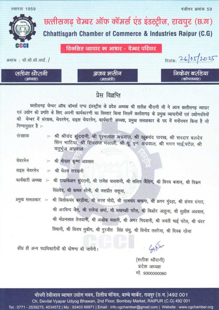 रायपुर। छत्तीसगढ़ चेंबर ऑफ कॉमर्स एंड इंडस्ट्रीज के प्रदेश अध्यक्ष सतीश थारवानी ने प्रदेश में व्यापार और उद्योग को नई ऊंचाइयों तक पहुंचाने के लिए अपनी कार्यकारिणी का बहुप्रतीक्षित विस्तार कर दिया है। सबसे महत्वपूर्ण बात, चेंबर के 50 वर्षों के इतिहास में पहली बार बिलासपुर से कार्यकारी अध्यक्ष का पद एवं संगठन-संविधान संशोधन-समन्वयक की जिम्मेदारी श्री कमल सोनी (प्रदेश अध्यक्ष, छत्तीसगढ़ सराफा एसोसिएशन) को सौंपी गई है। यह न केवल बिलासपुर के लिए गर्व का क्षण है, बल्कि पूरे चेंबर के लिए एक ऐतिहासिक बदलाव का संकेत है। बिलासपुर के गौरव कमल सोनी को इस नई जिम्मेदारी के लिए हार्दिक शुभकामनाएं दी गई हैं।