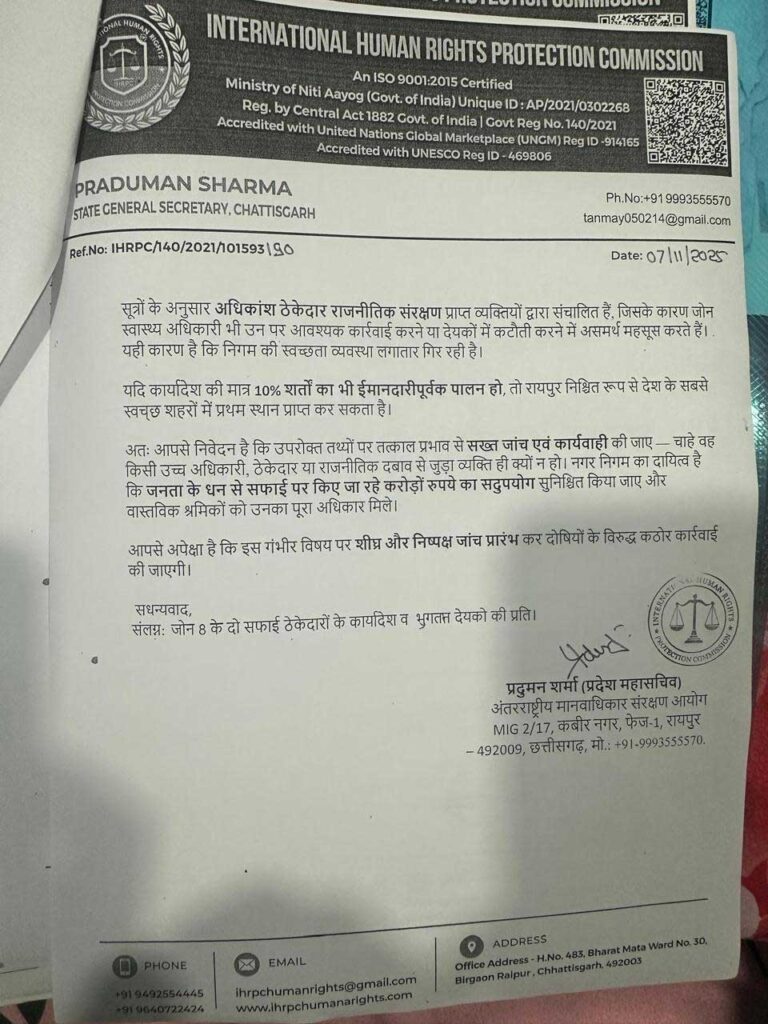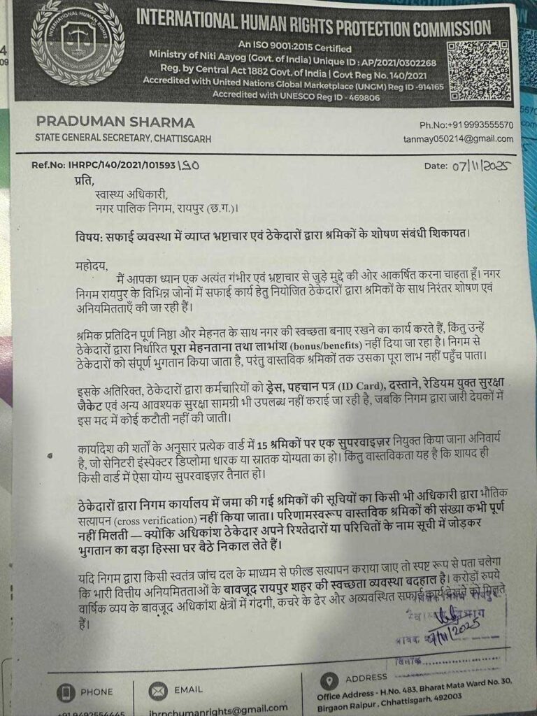 अंतराष्ट्रीय मानवाधिकार संरक्षण आयोग (IHRPC) ने नगर पालिक निगम रायपुर के स्वास्थ्य अधिकारी को पत्र लिखकर  शहर की सफाई व्यवस्था में व्याप्त भ्रष्टाचार, ठेकेदारों द्वारा श्रमिकों के शोषण, और प्रशासनिक लापरवाही के विरुद्ध गंभीर शिकायत दर्ज की है।